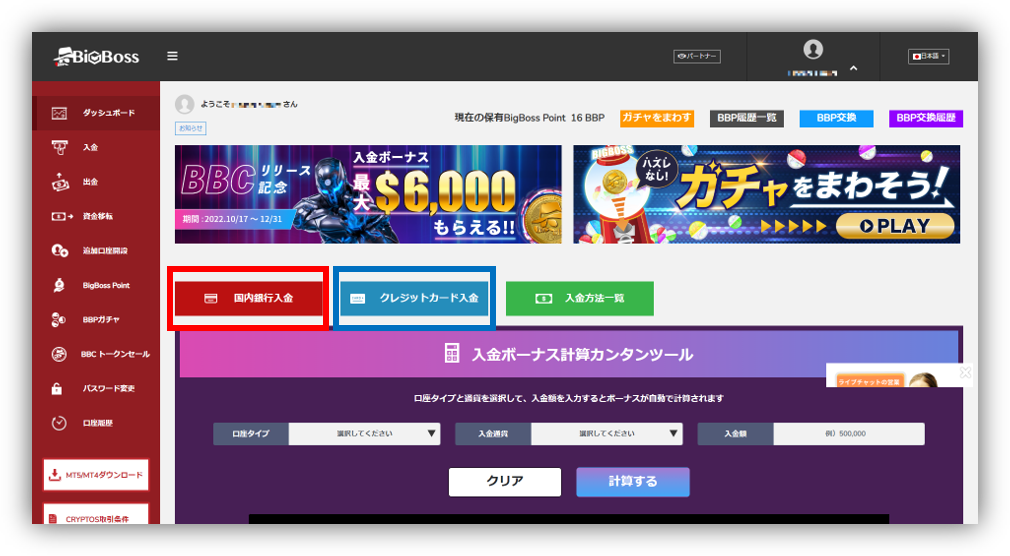 入金方法は銀行振込クレジットカード入金のどちらかをお選びいただけます。 銀行振込をご希望の方は「国内銀行入金」を、クレジットカード入金をご希望の方は「クレジットカード入金」をクリックします。