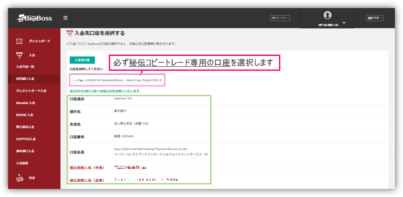 その際はBigBossカスタマーサポートまで、お名前、入金MT4口座番号、入金金額、入金日、入金明細を送付してご連絡ください。