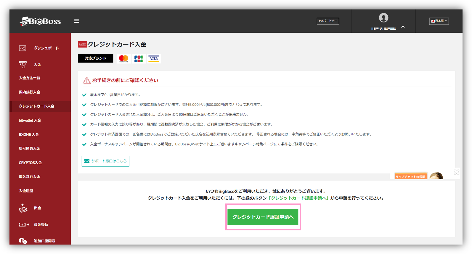 ・また、クレジットカードでのご入金の際のご出金は、クレジットカードへのご出金となる場合があります。 詳しくはBigBossカスタマーサポートまでご連絡ください。