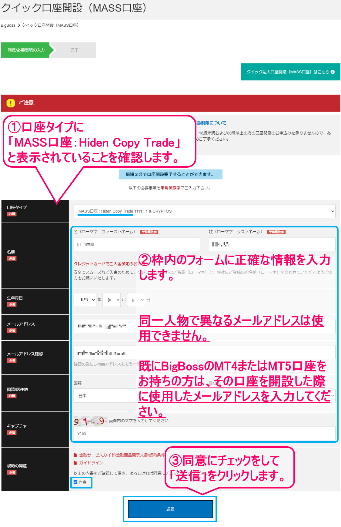 以下の口座開設マニュアルに沿って秘伝コピートレード専用の口座の開設を行なってください。